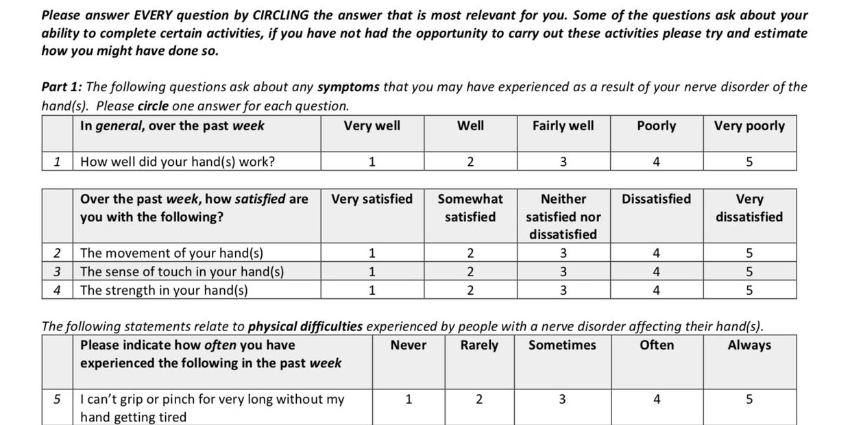 The PROM is designed specifically with nerve dysfunction at the core and evaluates impact on patients lives. The PROM is being further evaluated by the HaPPeN team for use in digital nerve repair outcome assessment for use in a future multi-centre UK study of digital nerve repair.